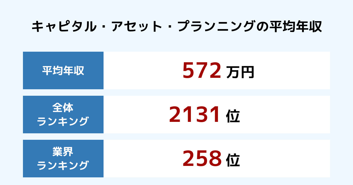 キャピタル アセット プランニングの年収 2020年最新版 年別推移と業界内順位 従業員数 平均年齢 勤続年数も紹介 年収ランキング