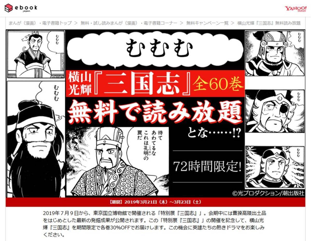 Ebookjapan 横山光輝の 三国志 全60巻を72時間 無料 読み放題を実施