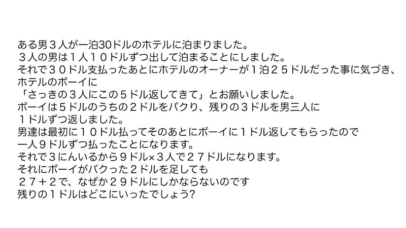 昔流行ったクイズ 消えた1ドル ホテル代金が返金されるも何故か1ドル足りない Middle Edge ミドルエッジ